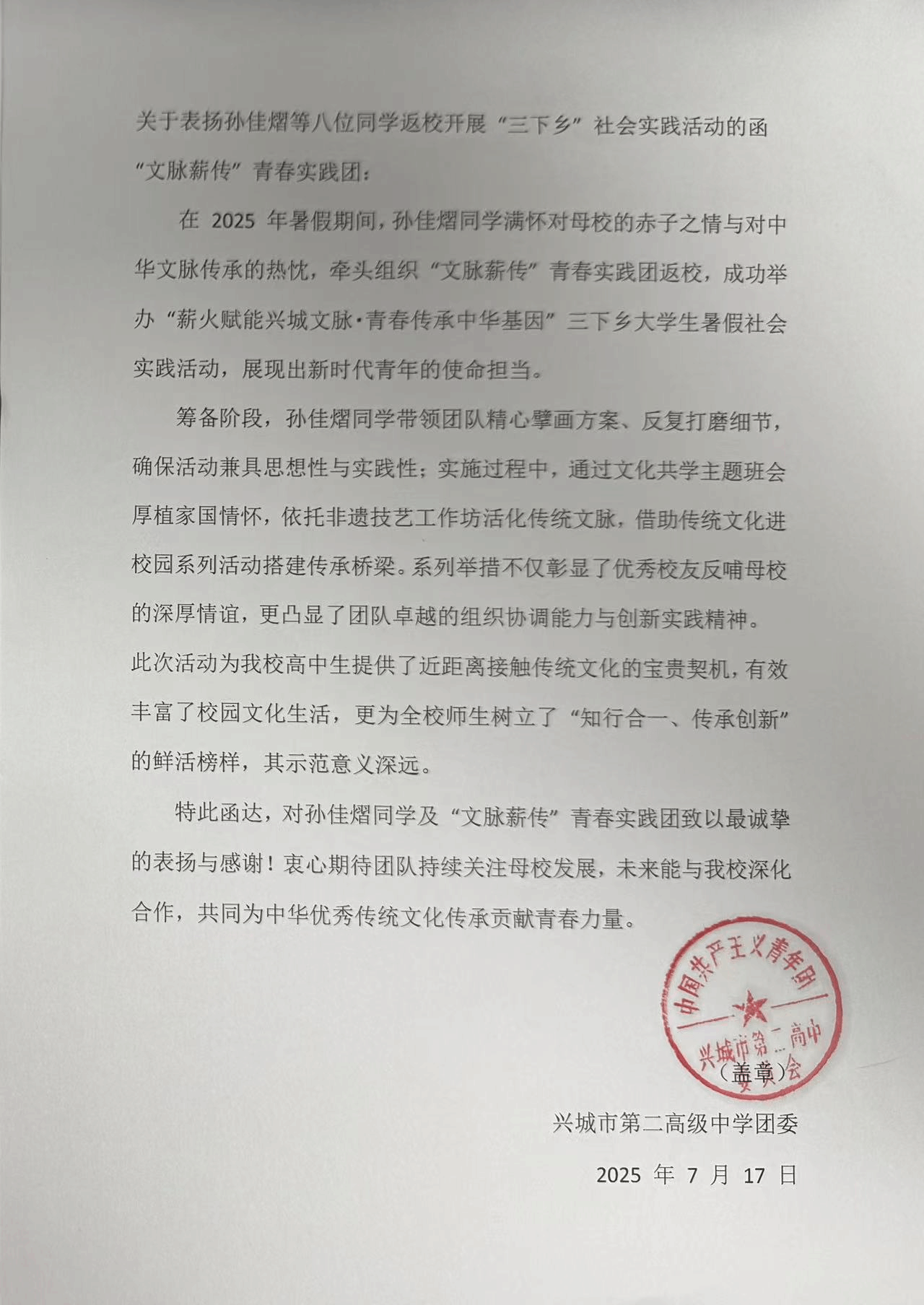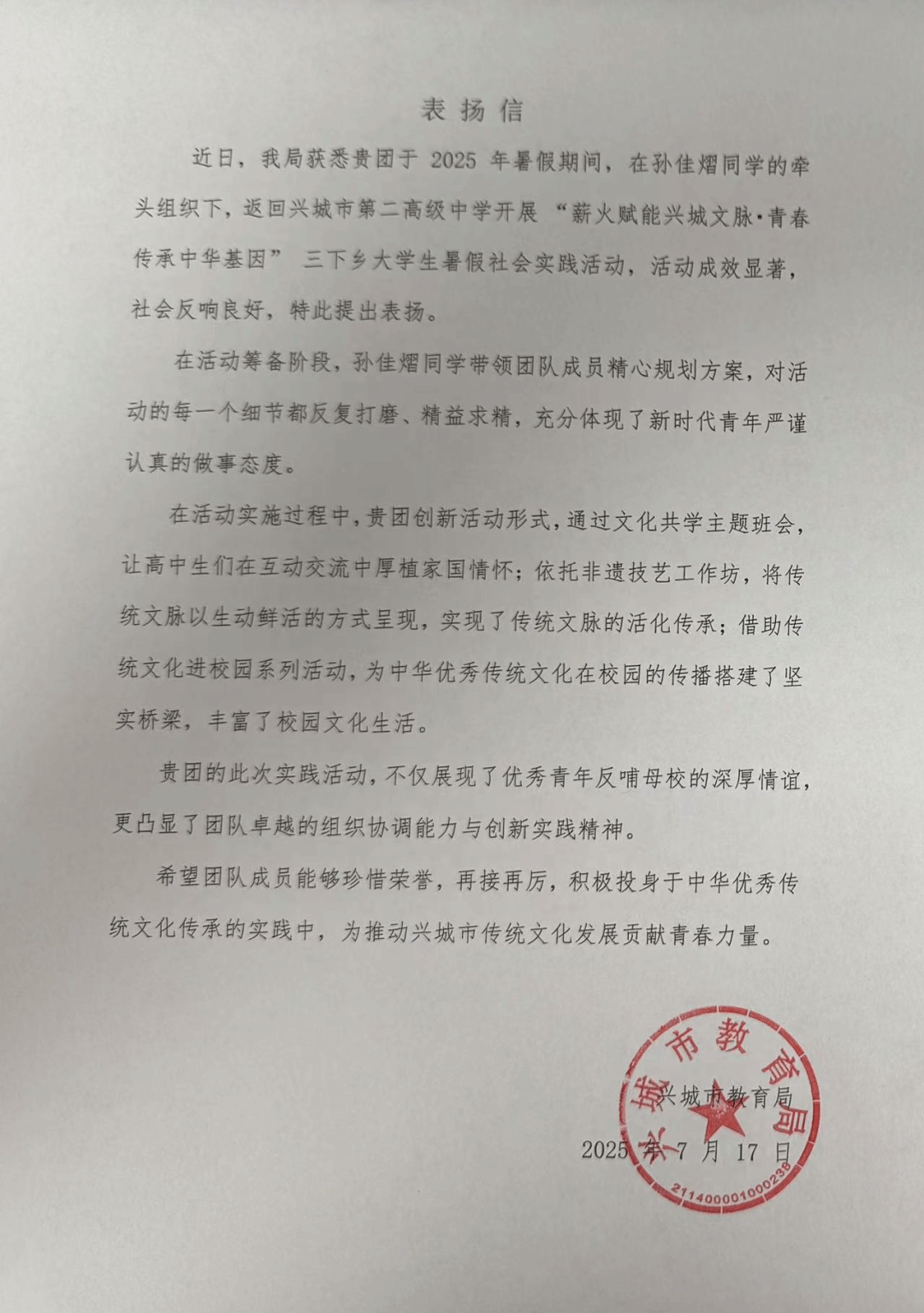 此次活动成效显著,得到了兴城市教育局与兴城市第二高级中学的高度认可,双方特地为孙佳熠等8名实践团成员颁发表扬信,以表彰他们在文化传承活动中展现的责任担当与扎实行动力。