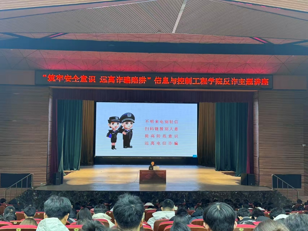 为帮助学生提升反诈警惕性,增强自我财产保护能力,近日,信息与控制工程学院分别于音乐厅、明德楼400教室开展“筑牢安全意识,远离诈骗陷阱”反诈主题讲座。本次讲座由浑南新城派出所警官担任主讲人,2025级全体学生到场聆听学习。
