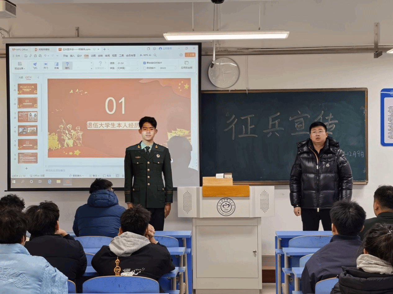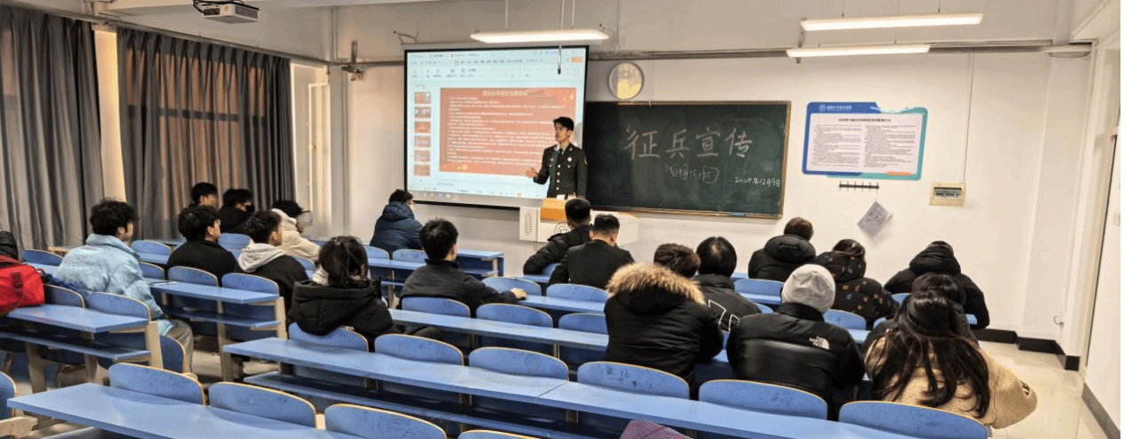 为深入贯彻落实国家征兵工作相关要求,切实做好2026年征兵宣传动员工作,激发学院学子投身军营、报效祖国的热情,12月9日,信息与控制工程学院在明德楼512教室召开征兵政策宣传宣讲会。学院征兵工作负责人屠盛达主持会议,特别邀请校军事教育协会行政主席相博译、信息学院退役士兵李权真担任分享嘉宾,学院各年级意向参军学生积极参会。