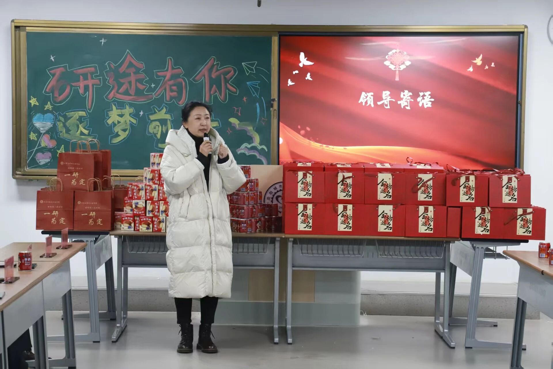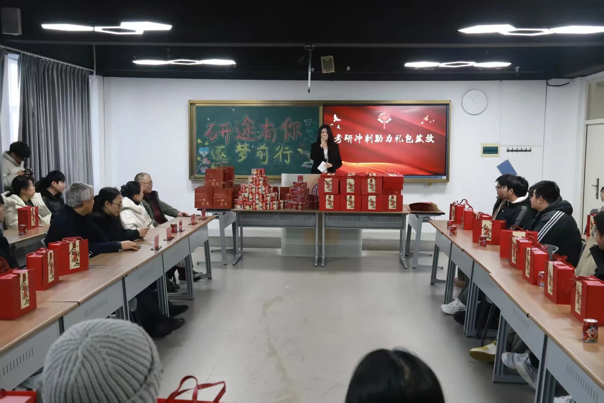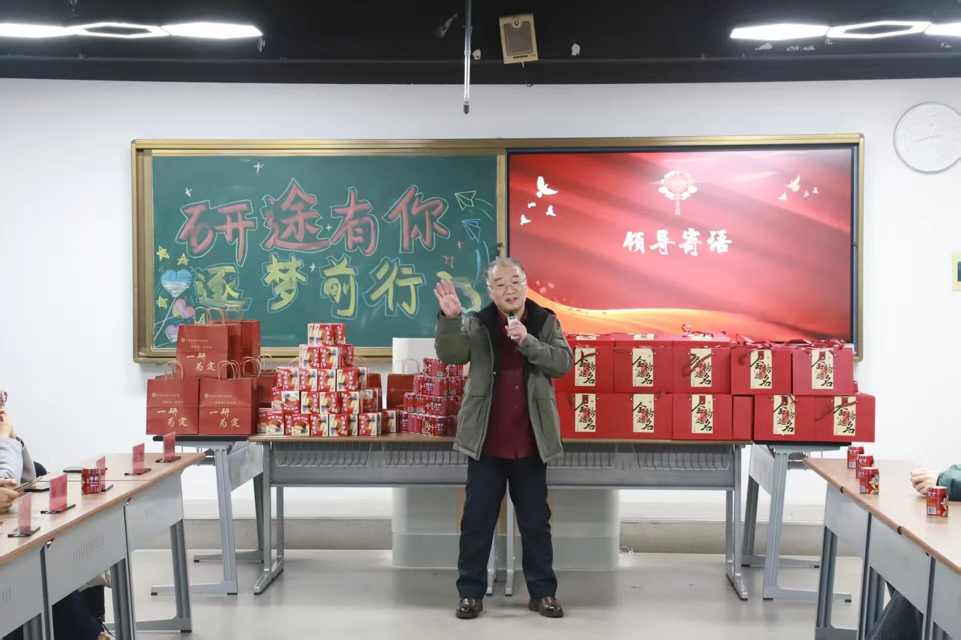 大会紧扣“研途有你,逐梦前行”主题,流程紧凑温馨。开场的暖心短视频,汇集了学院老师的殷切期盼与家人的深情牵挂,真挚的情感传递让现场学子倍感温暖,注入满满精神动力。随后,院长郝培锋、党总支书记靳凯分别致辞,回顾学子们日夜苦读的备考历程,肯定大家的坚持与付出,同时从心态调整、复习策略、劳逸结合等方面给出针对性建议,叮嘱学子们在最后9天稳扎稳打、查漏补缺,以从容自信的姿态迎战考试。