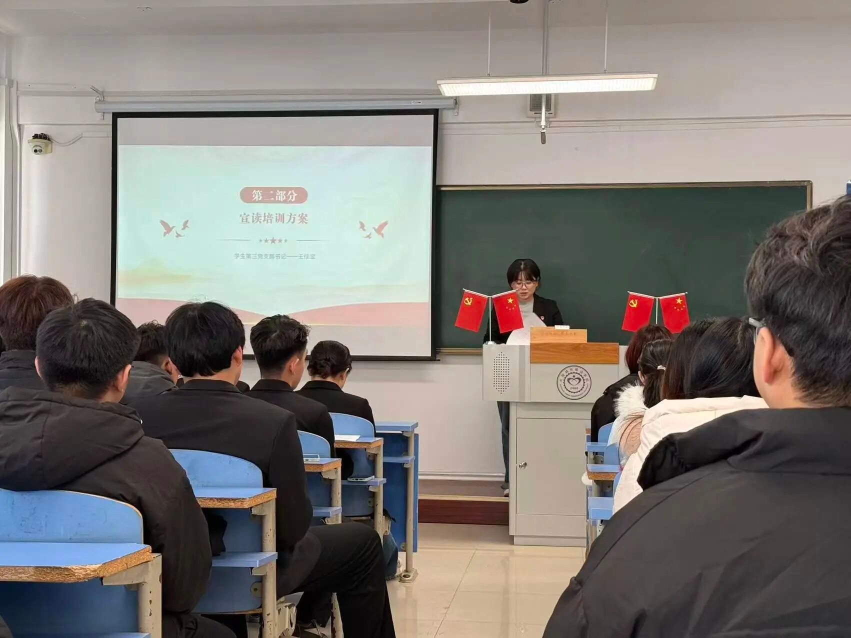 仪式在庄严的国歌声中拉开帷幕,全体与会人员起立,面向国旗肃立致敬,在激昂的旋律中表达对党的忠诚与热爱。会议伊始,王佳宝宣读积极分子培训方案,解读培训内容,明确培训以“强化思想引领、锤炼党性素养、提升综合能力”为核心目标,为学员成长划定清晰方向。预备党员代表黄俊豪分享了自己的成长经历,他结合自身从入党积极分子到预备党员的转变过程,鼓励学员们既要深耕专业知识,将理论学习成果转化为提升专业技能的动力;又要严守纪律规矩,从日常言行等小事做起,自觉以党员标准约束自身行为,切实发挥模范带头作用。随后,学生孙国睿代表全体入党积极分子郑重承诺,将始终牢记初心使命,主动把个人理想追求融入党和国家事业发展大局;在学习上刻苦钻研,在实践中勇于担当,在纪律上严于律己,以饱满的热情和务实的作风完成培训任务。